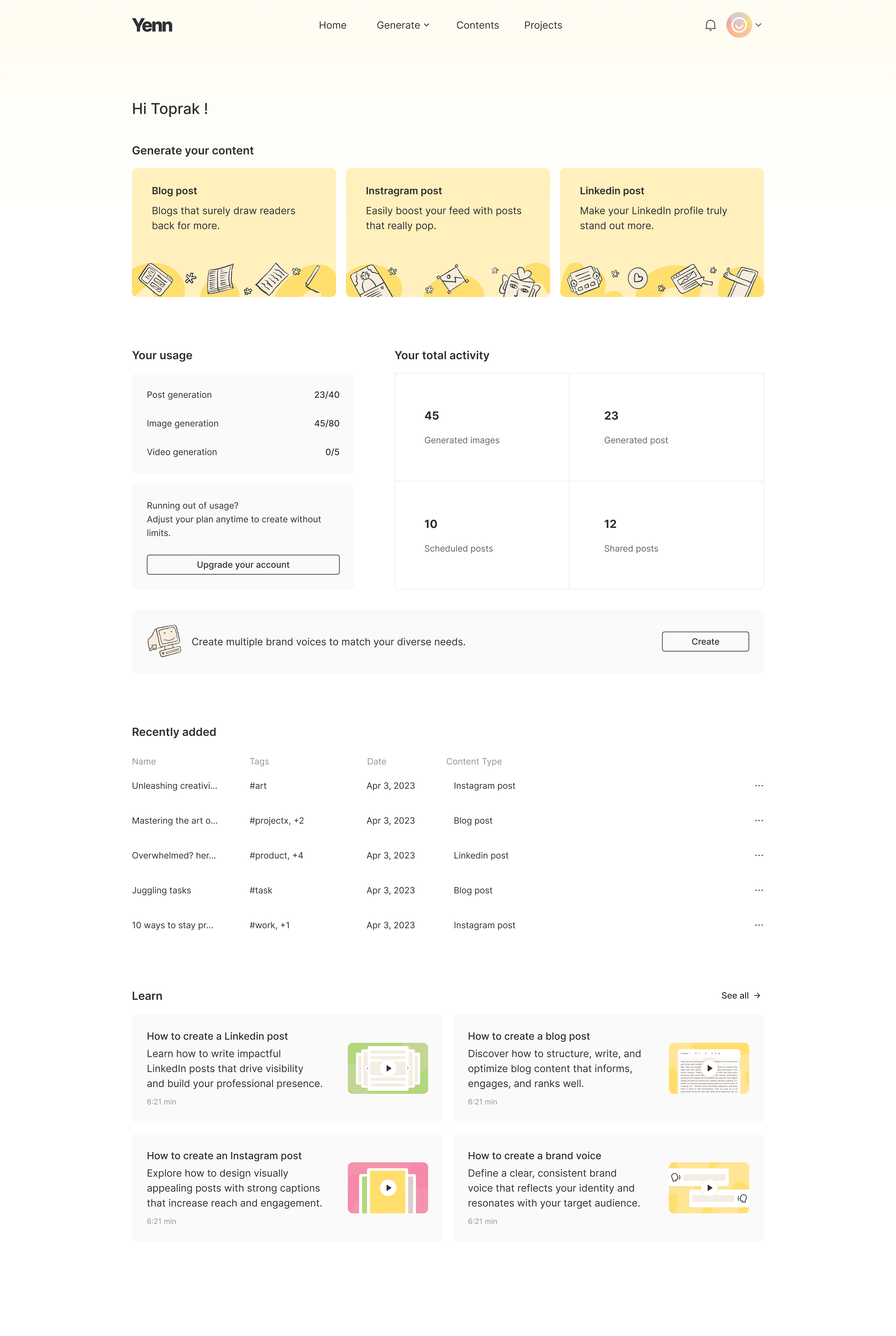 Unlike generic AI tools, Yenn understands your brand voice, analyzes trends, and generates content that truly fits your style.