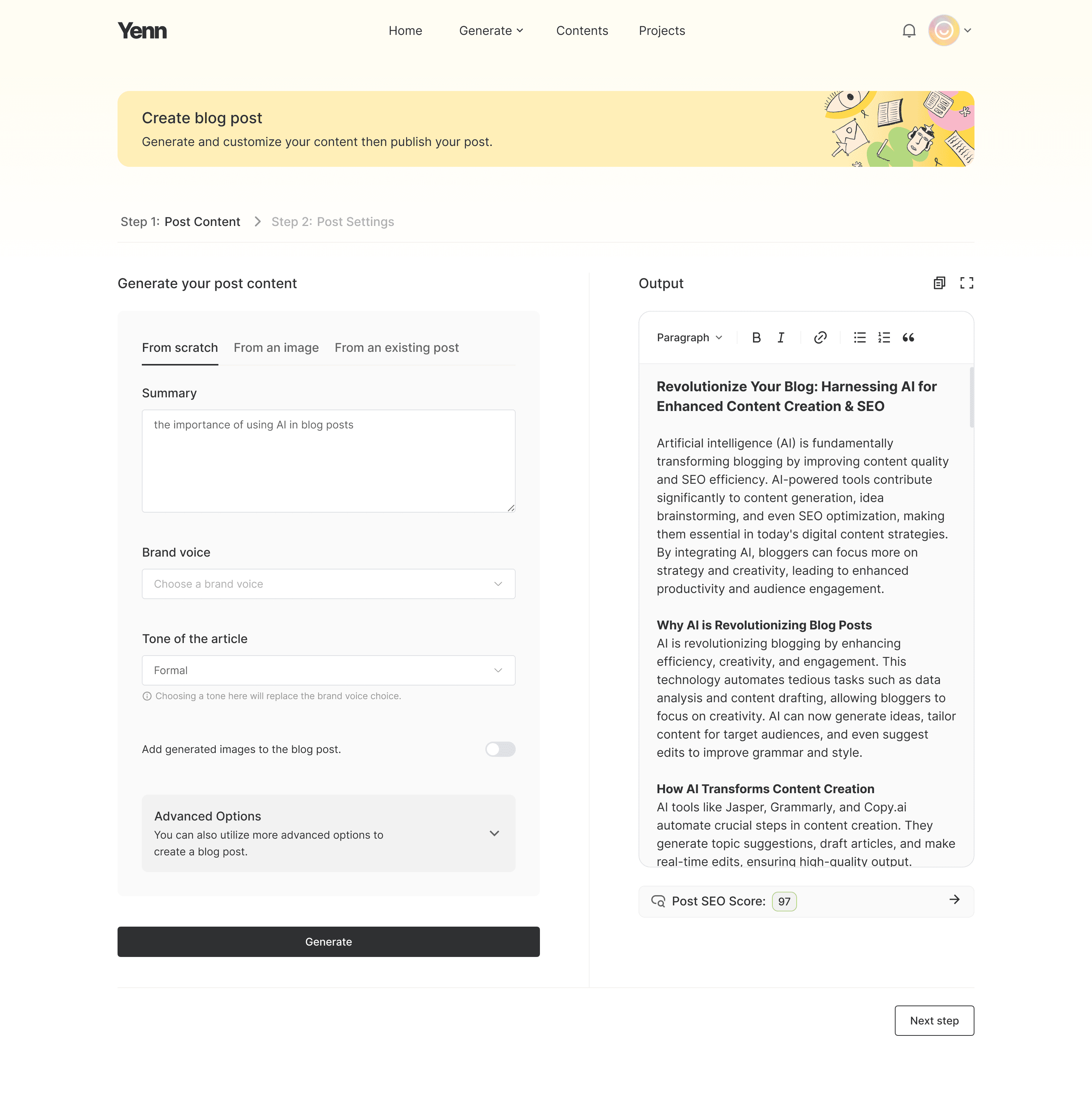 Yenn generates full blog posts in seconds, with no setup no delay.