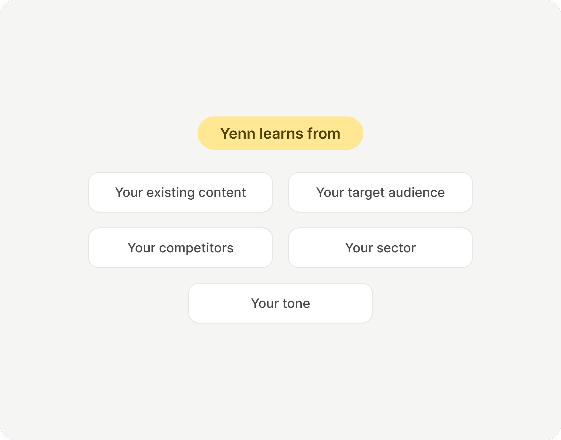 Once Yenn has learned your voice, every piece it generates reflects it. Not just the vocabulary, the way you open a point, the level of formality you maintain, the specific way your brand frames problems and solutions. You don't need to re-prompt for every piece. The voice travels with the system.