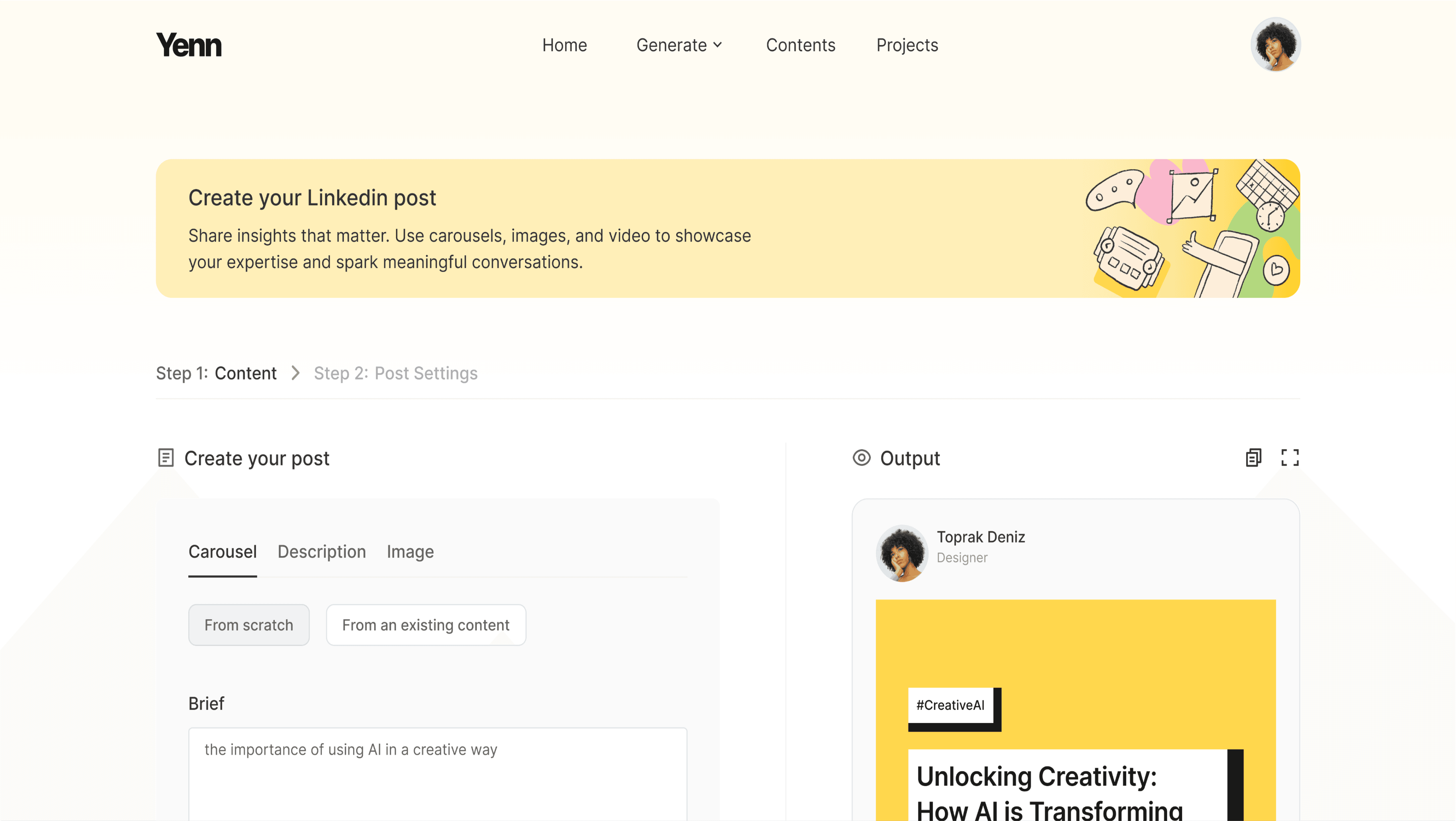 You can create carousels, descriptions, and image posts with Yenn.
